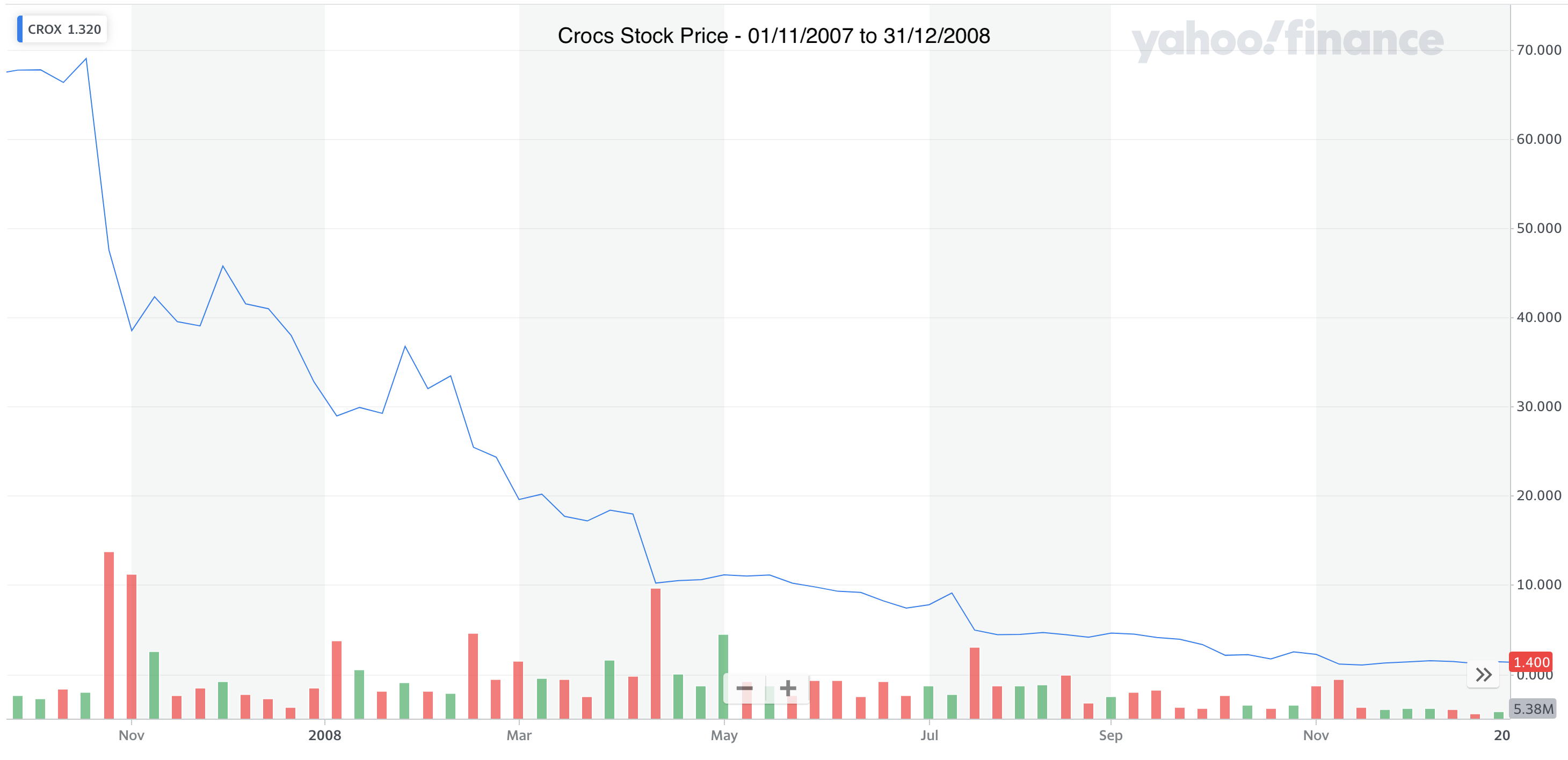 The 2008 crisis was an extremely difficult time for many companies — and Crocs was not exempt from hardship. Unfortunately for them, the financial crisis meant that consumers were saving as much money as possible and frivolous purchases were cut to a minimum. In turn, this meant that Crocs was faced with a mountain of unsold shoes. After record-sales in 2007, the company found itself dealing with a $185 million loss in 2008, sending the company into a tailspin. The stock plummeted from ~$67 to just ~$1,10 in less than a year.